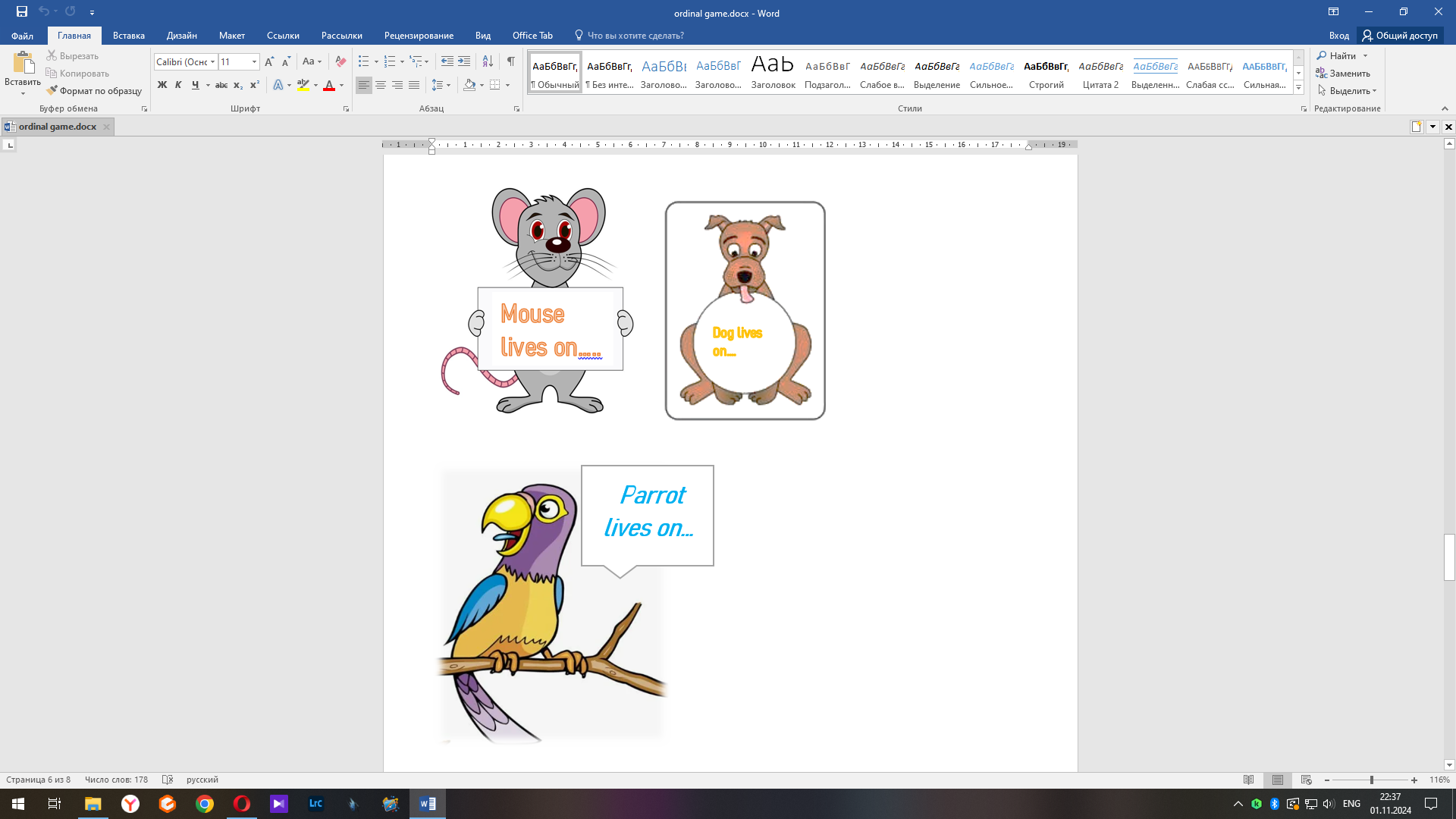 Учитель размещает животных или животное по этажам, ученики составляют предложение на каком этаже проживает данный герой.