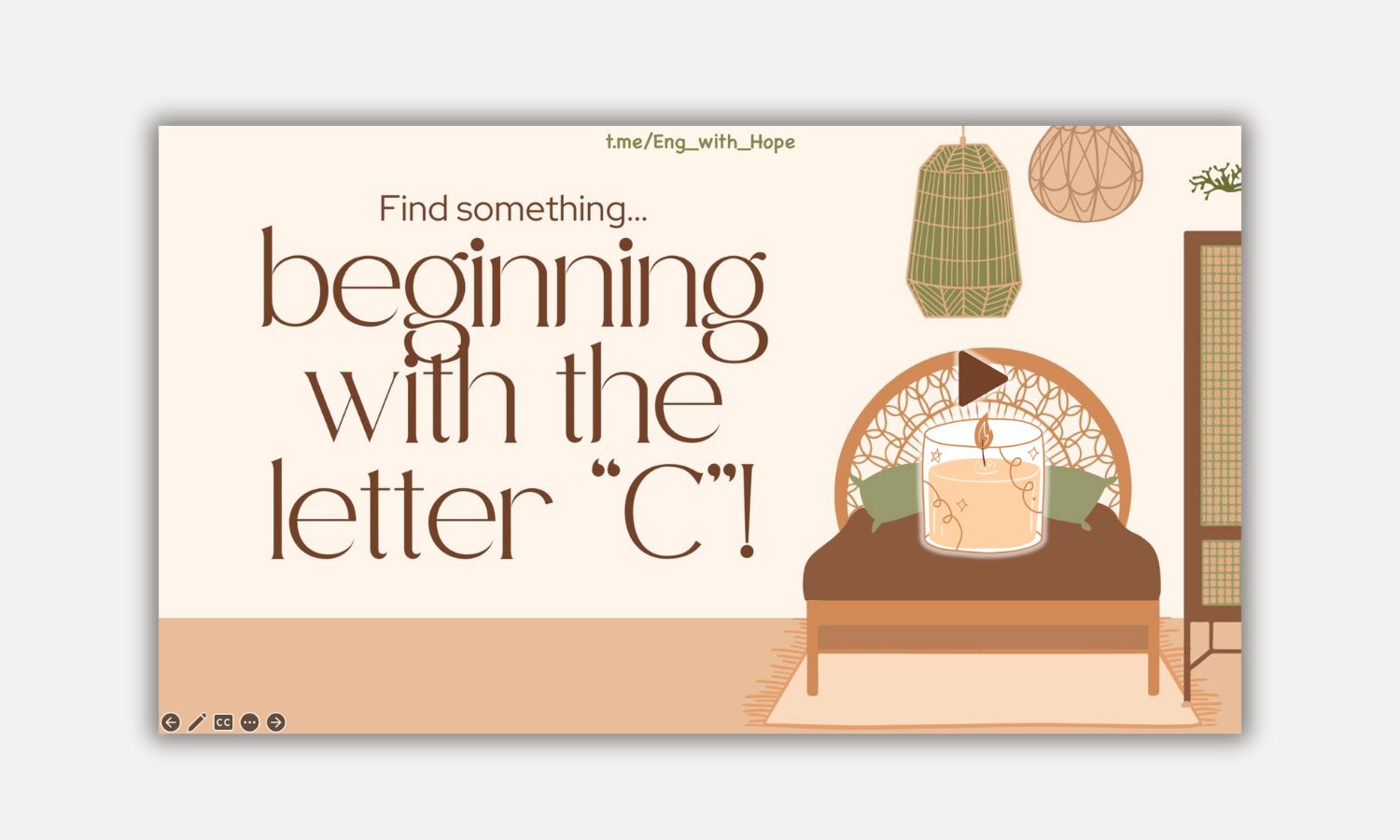 Когда ученик находит предмет, он должен назвать его на английском языке. Если уровень ученика позволяет, то можно попросить его описать предмет, рассказать про него историю (например, как он появился) или ответить на вопросы.