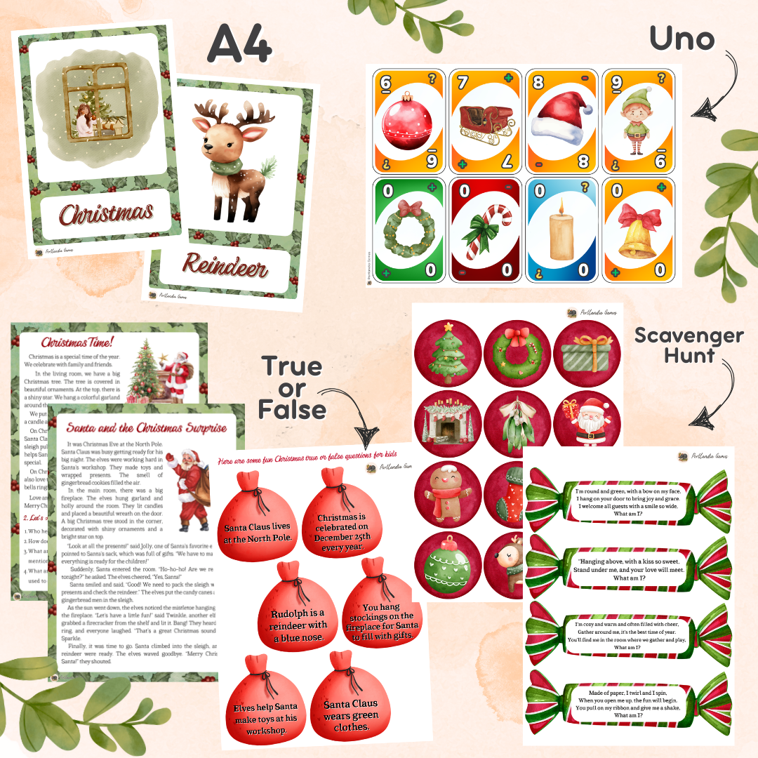 Santa is very busy. He needs helpers! Answer the questions and complete small actions. If you do it, you get a Help Token. The first player with 5 Help Tokens wins.
